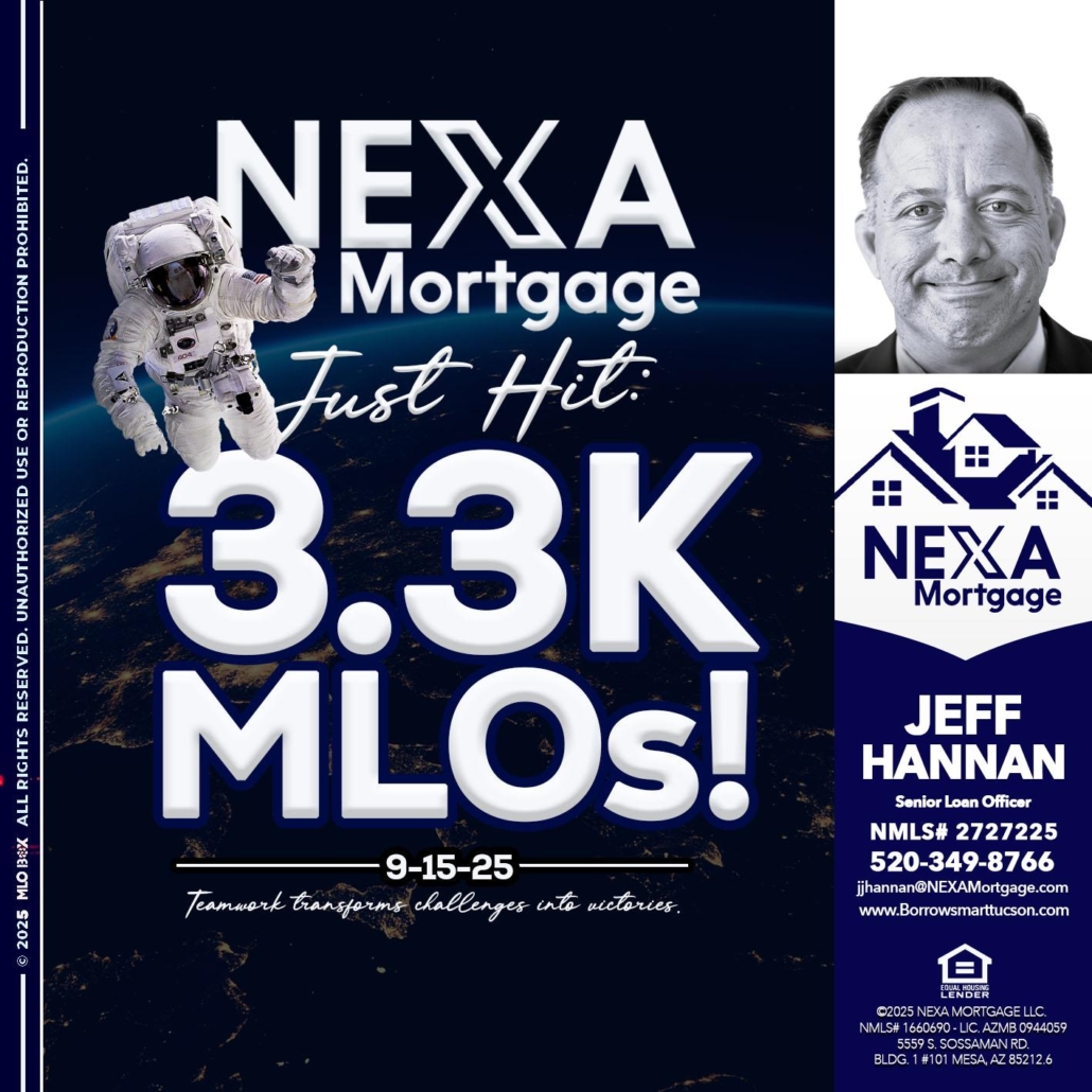 3.3K - Jeff Hannan -Senior Loan OfficerHi, my name is Jeff Hannan. I’m a Loan Officer with NEXA Mortgage LLC., offering personalized mortgage solutions, fast customized quotes, great rates and service with integrity.